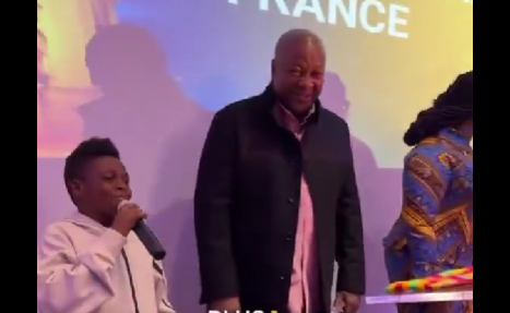 Actor Yaw Dabo met President Mahama in Paris, France, during a meeting with the Ghanaian community, where he commended the President for his financial support and efforts to raise standards for Premier League teams in Ghana.